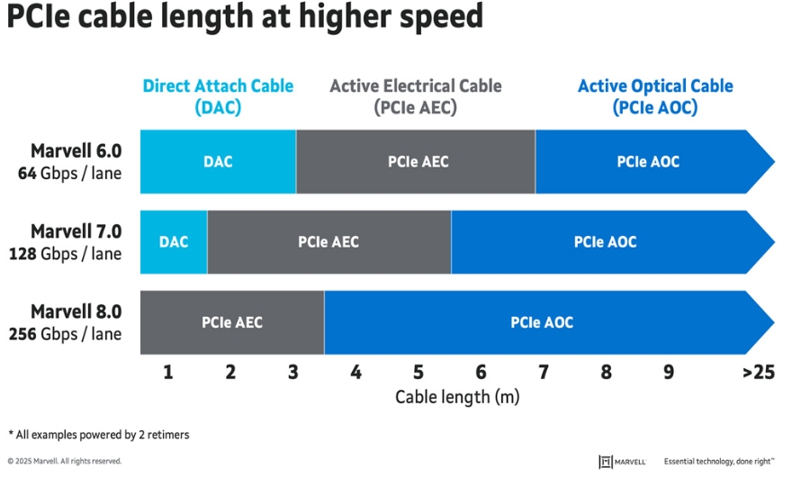 PCIe 6.0有源电缆(AEC)可用于最长7米的链路,而PCIe 6.0有源光缆(AOC)则可延伸更远,内置了Marvell® Alaska ® P PCIe定时器。供参考,AEC是铜缆,端子集成了数字信号处理器(DSP),以提升信号完整性。AOC是带有DSP、放大器和驱动器以扩大覆盖范围的光缆。AOC更远,但额外的组件意味着更高的动力和成本。