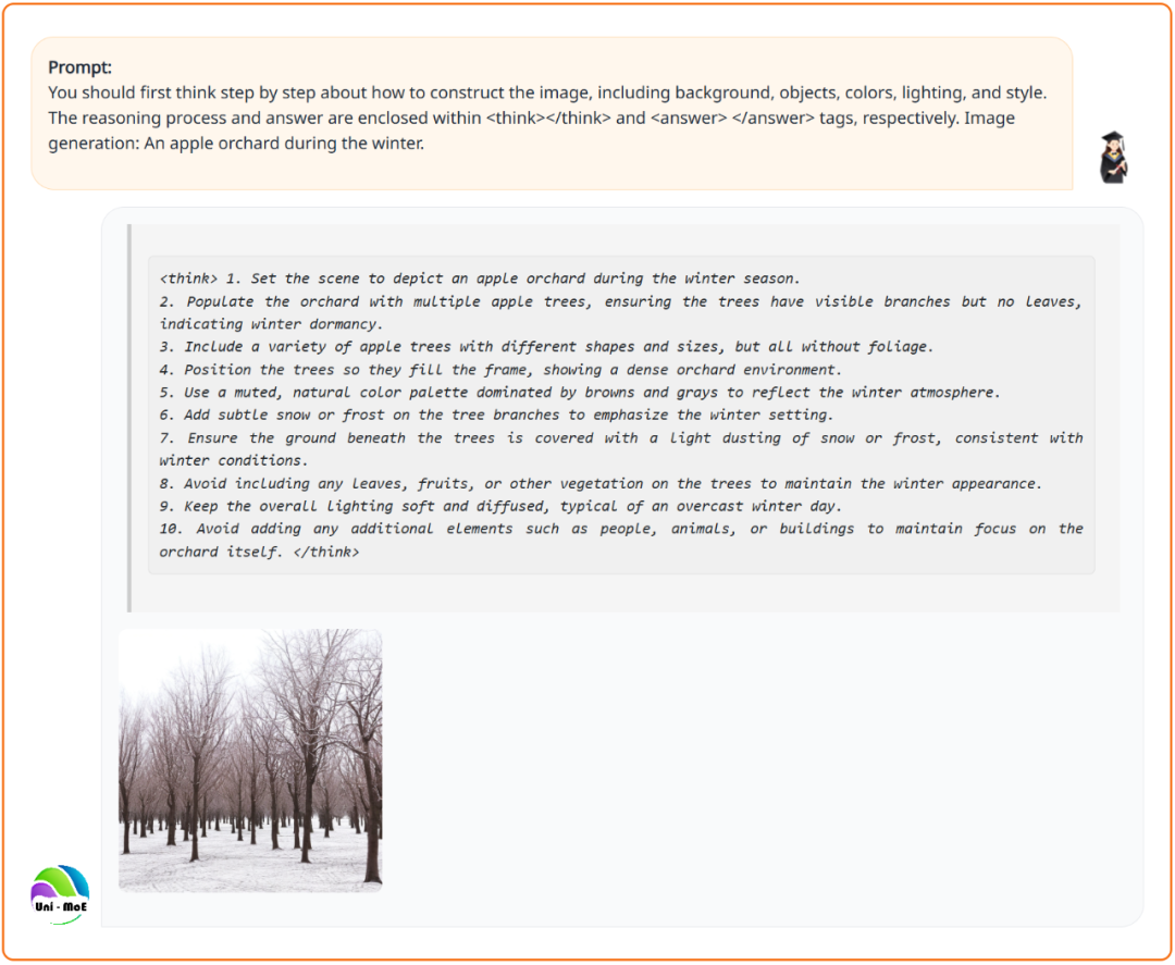 3. 全模态生成器:Uni-MoE-2.0-Omni 通过特殊的控制 Token,将所有理解与生成任务统一纳入语言模型的语义空间,实现了理解即生成的无缝流转:在语音生成方面,其上下文信息驱动的 Uni-MoE-TTS 可以实现两分钟以上的语音回复,支持中英三种音色。在视觉生成方面:引入任务感知的扩散模型,通过深度融合视觉、任务与内容信号来联合驱动图像生成与编辑,显著提升了图像编辑和复原的准确性。