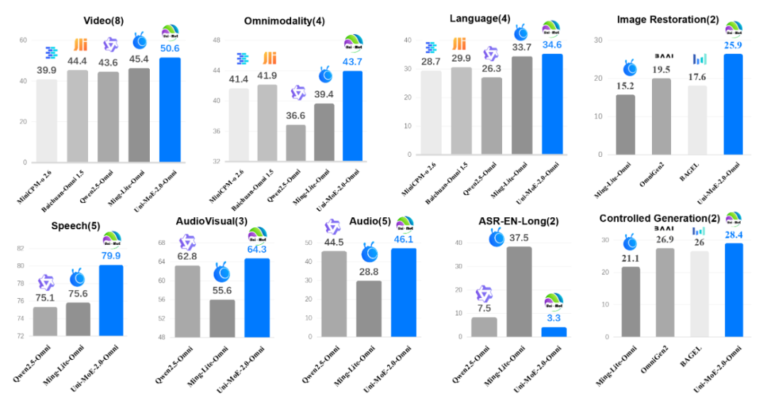 值得一提的是,Uni-MoE-2.0-Omni 在图像理解、视频推理、音频理解、语音生成、图像生成与编辑等 85 项基准上取得高度竞争性或领先的表现,在 76 项可对比评测中,Uni-MoE-2.0-Omni(75B Tokens)超越 Qwen2.5-Omni(1.2T Tokens)逾 50 项任务,不仅在视频理解和全模态交互上取得显著突破,更在长语音生成、多模态语音交互和可控图像生成与编辑方面树立了新标杆。