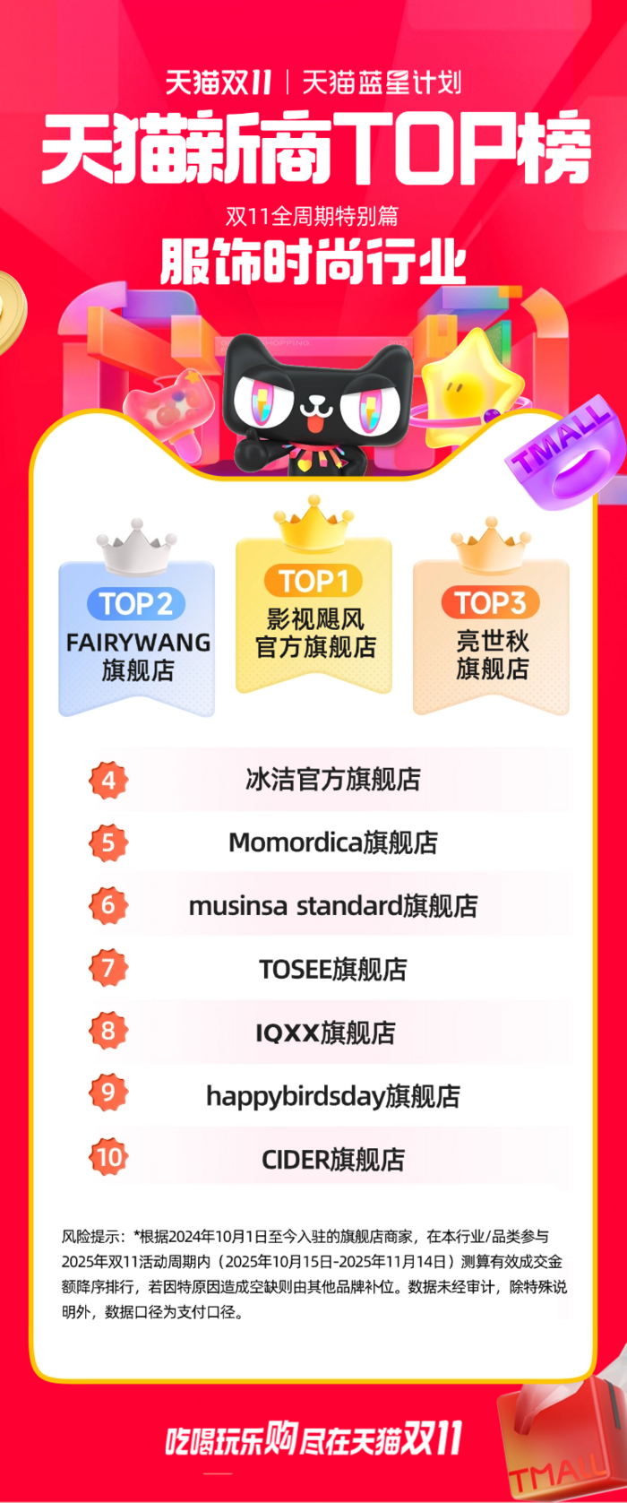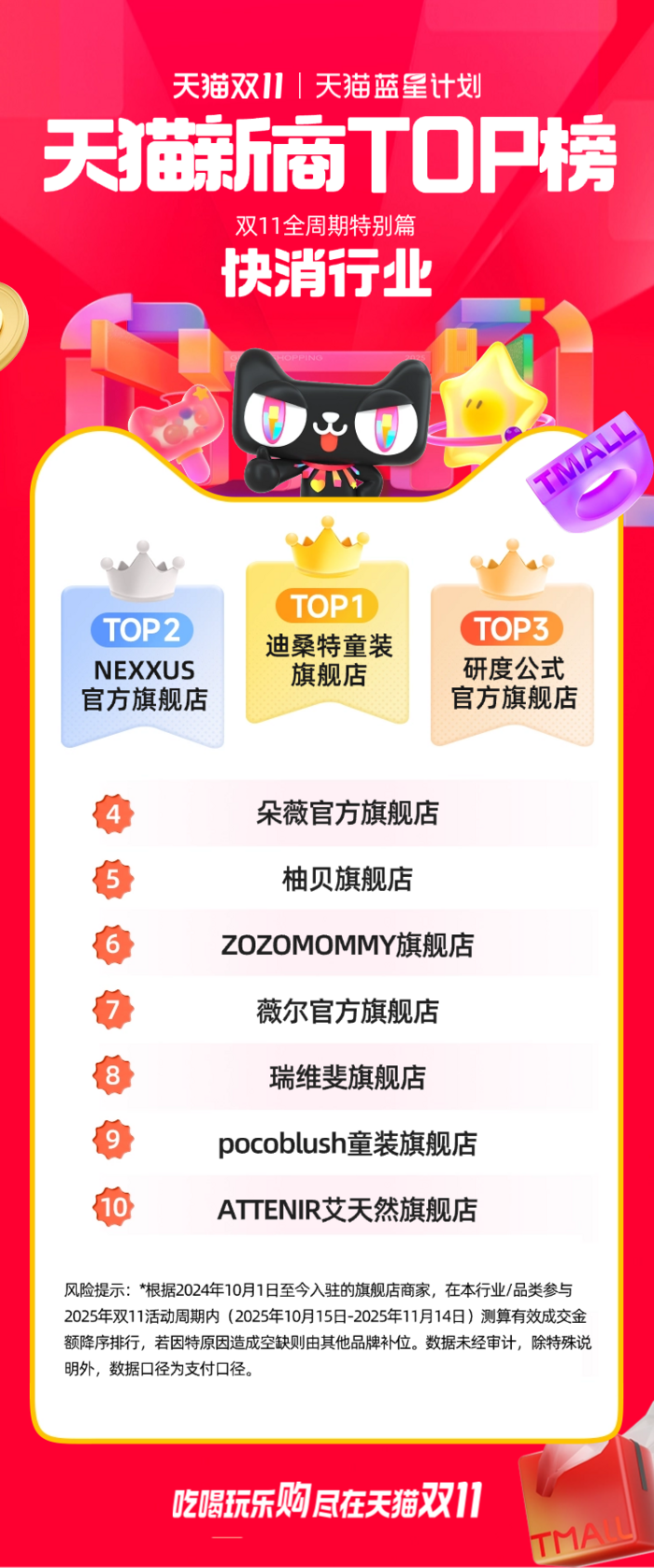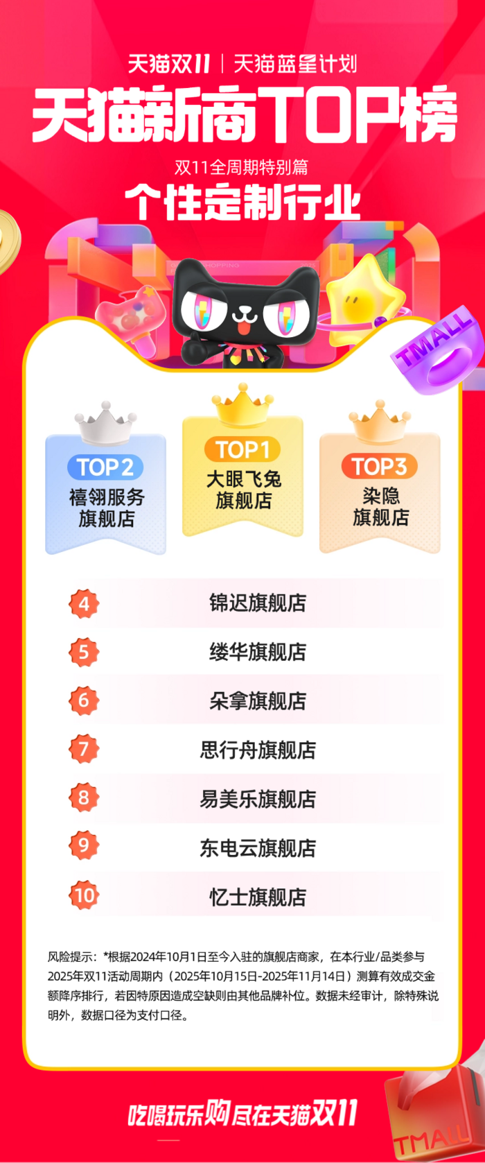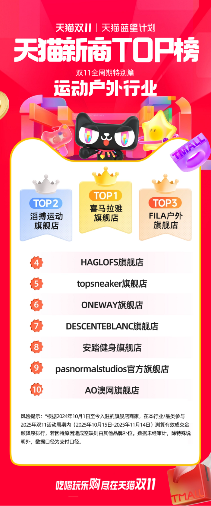 此次公布的天猫双11“新商TOP榜”,是根据2024年10月1日至今入驻的旗舰店商家,对在本行业/品类参与2025年双11活动周期内(2025年10月15日-2025年11月14日)测算的有效成交金额进行的降序排行。