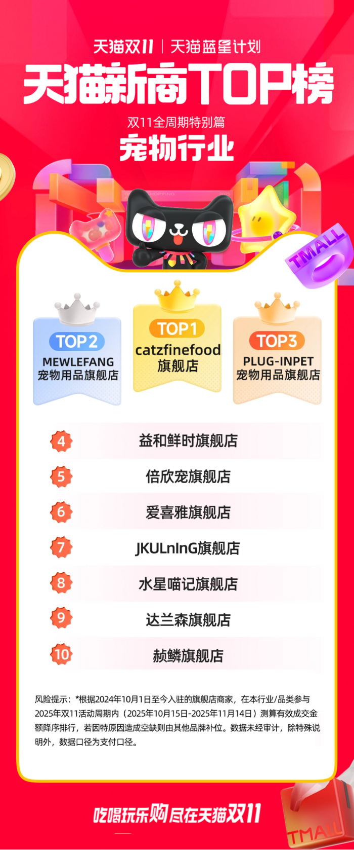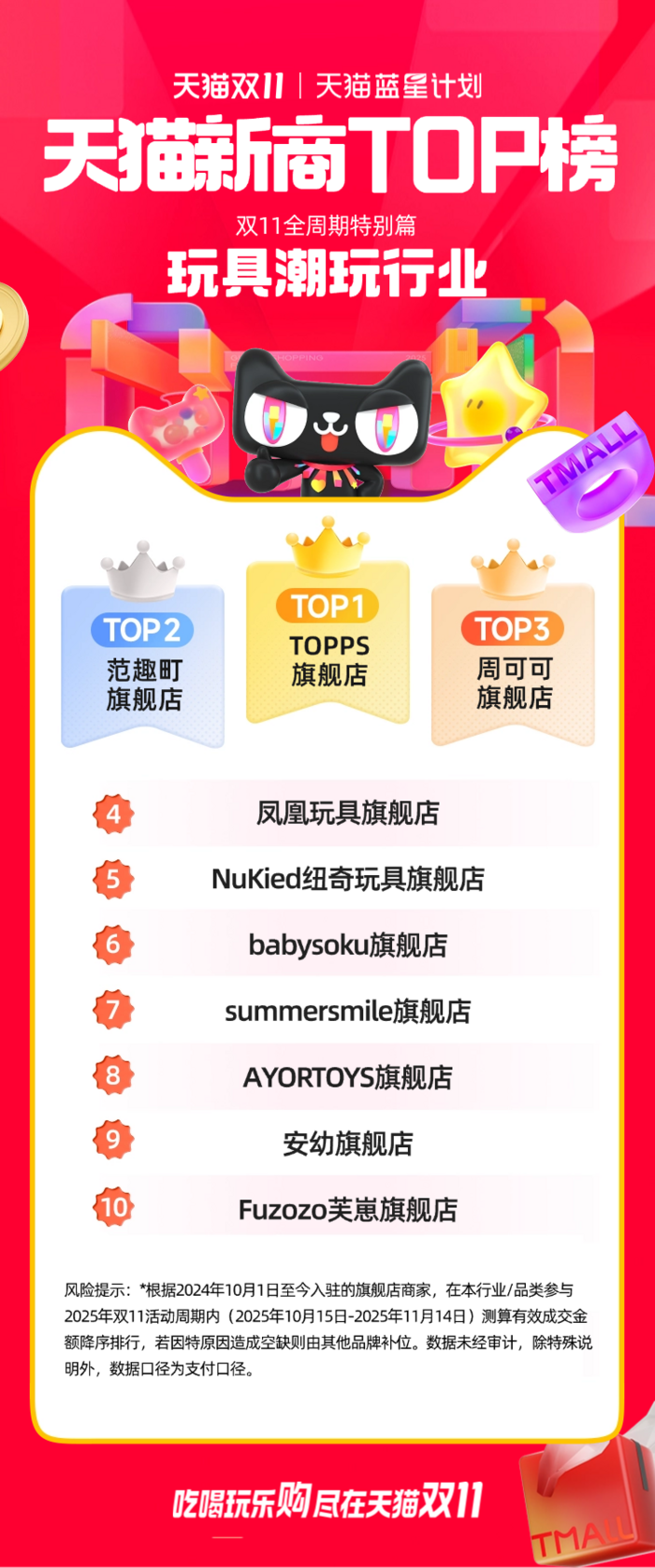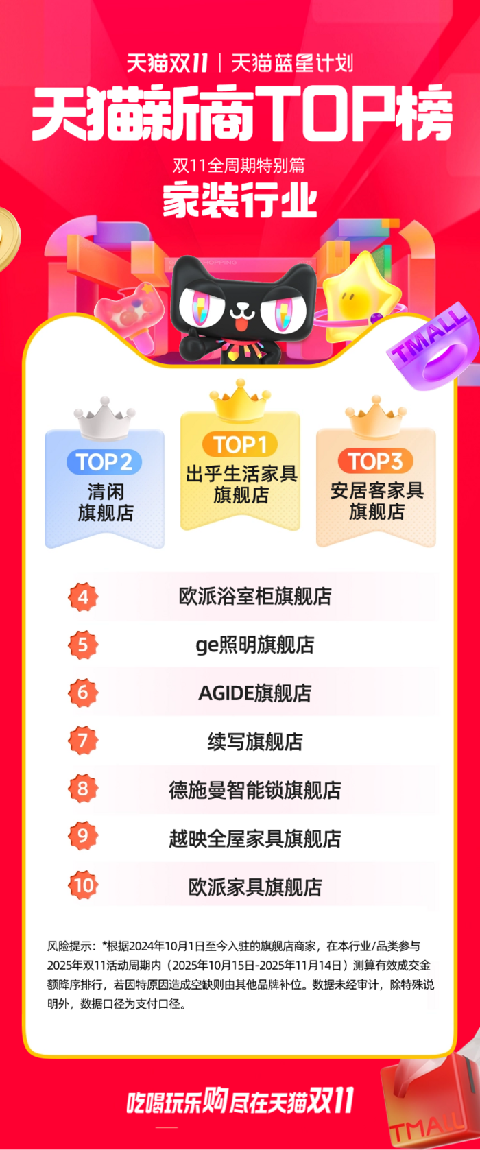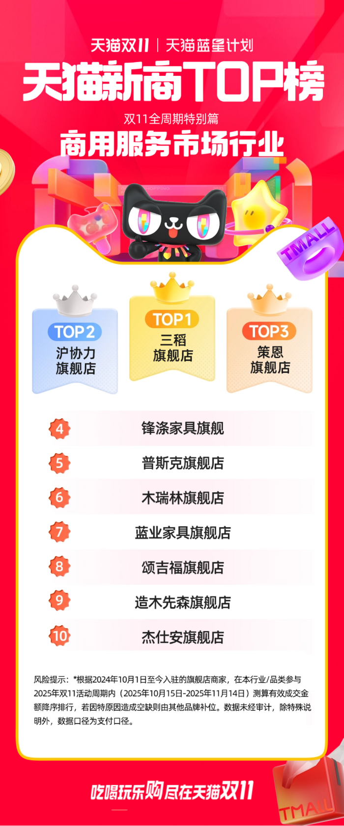 此次公布的天猫双11“新商TOP榜”,是根据2024年10月1日至今入驻的旗舰店商家,对在本行业/品类参与2025年双11活动周期内(2025年10月15日-2025年11月14日)测算的有效成交金额进行的降序排行。