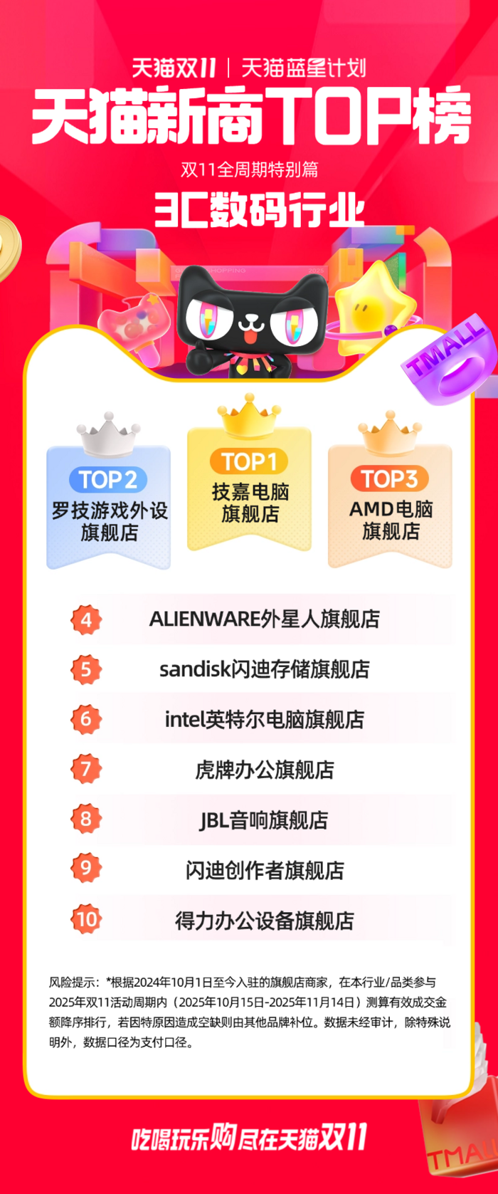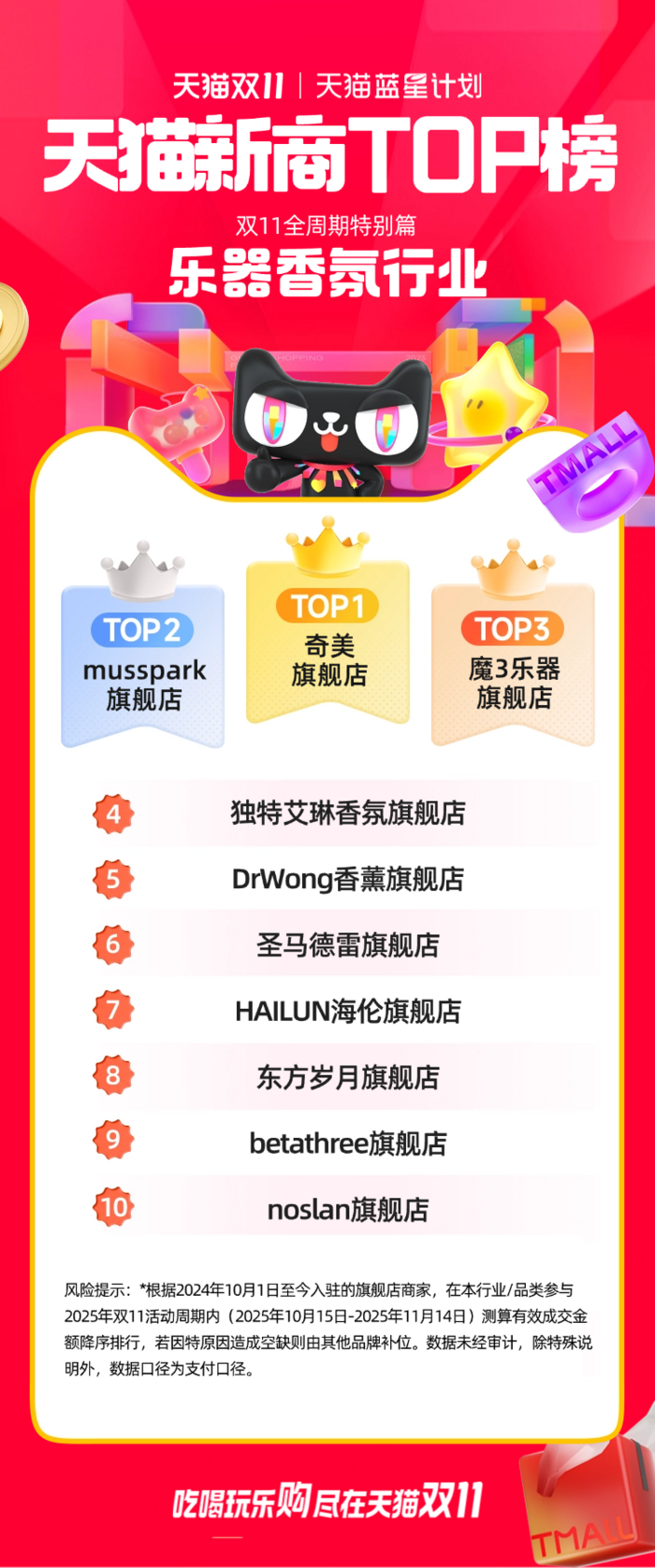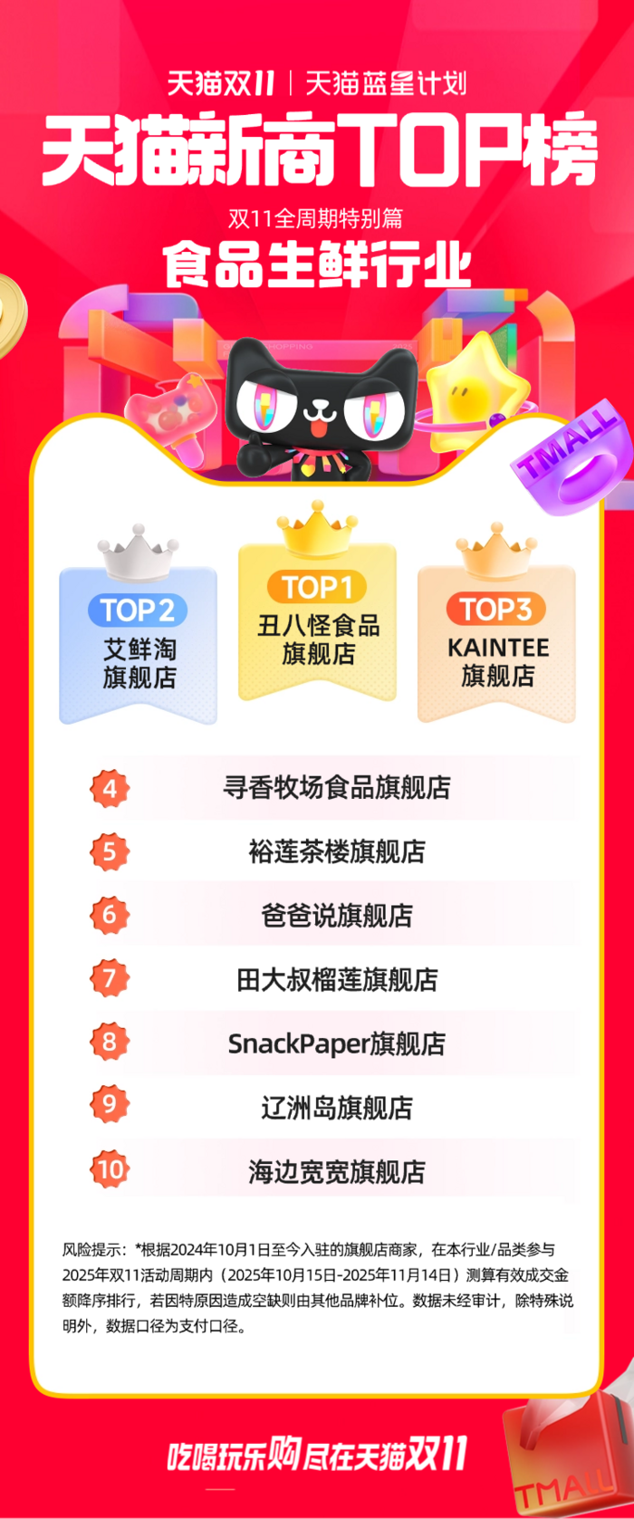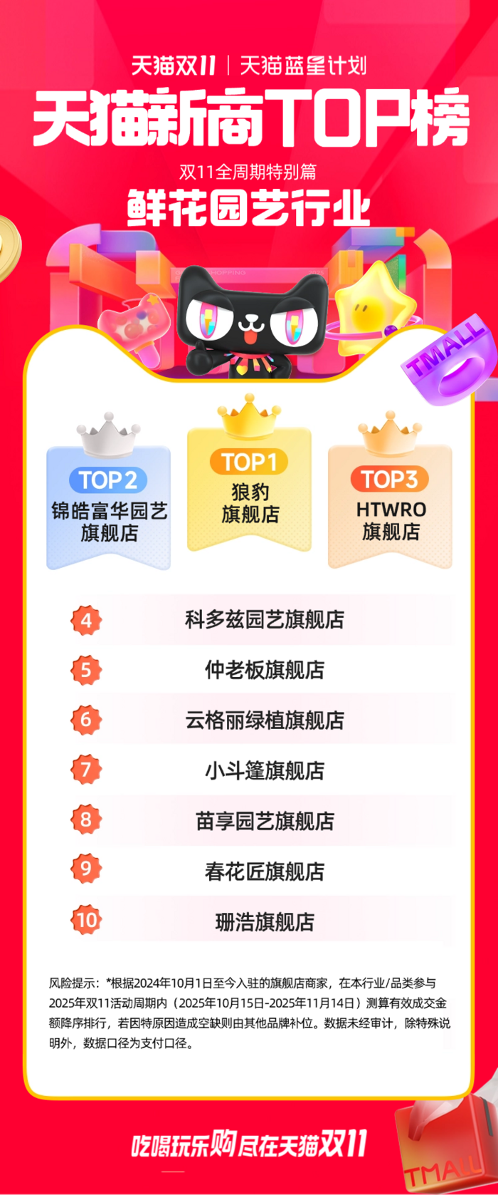 此次公布的天猫双11“新商TOP榜”,是根据2024年10月1日至今入驻的旗舰店商家,对在本行业/品类参与2025年双11活动周期内(2025年10月15日-2025年11月14日)测算的有效成交金额进行的降序排行。