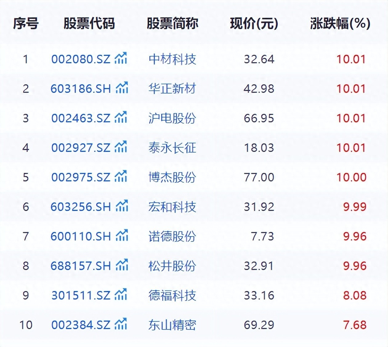 截至收盘,中材科技(002080.SZ)、华正新材(603186.SH)、沪电股份(002463.SZ)、泰永长征(002927.SZ)、博杰股份(002975.SZ)、宏和科技(603256.SH)、诺德股份(600110.SH)等多股涨停,天承科技(688603.SH)、景旺电子(603228.SH)、科强股份(920665.BJ)、生益电子(688183.SH)、温州宏丰(300283.SZ)等纷纷跟涨。