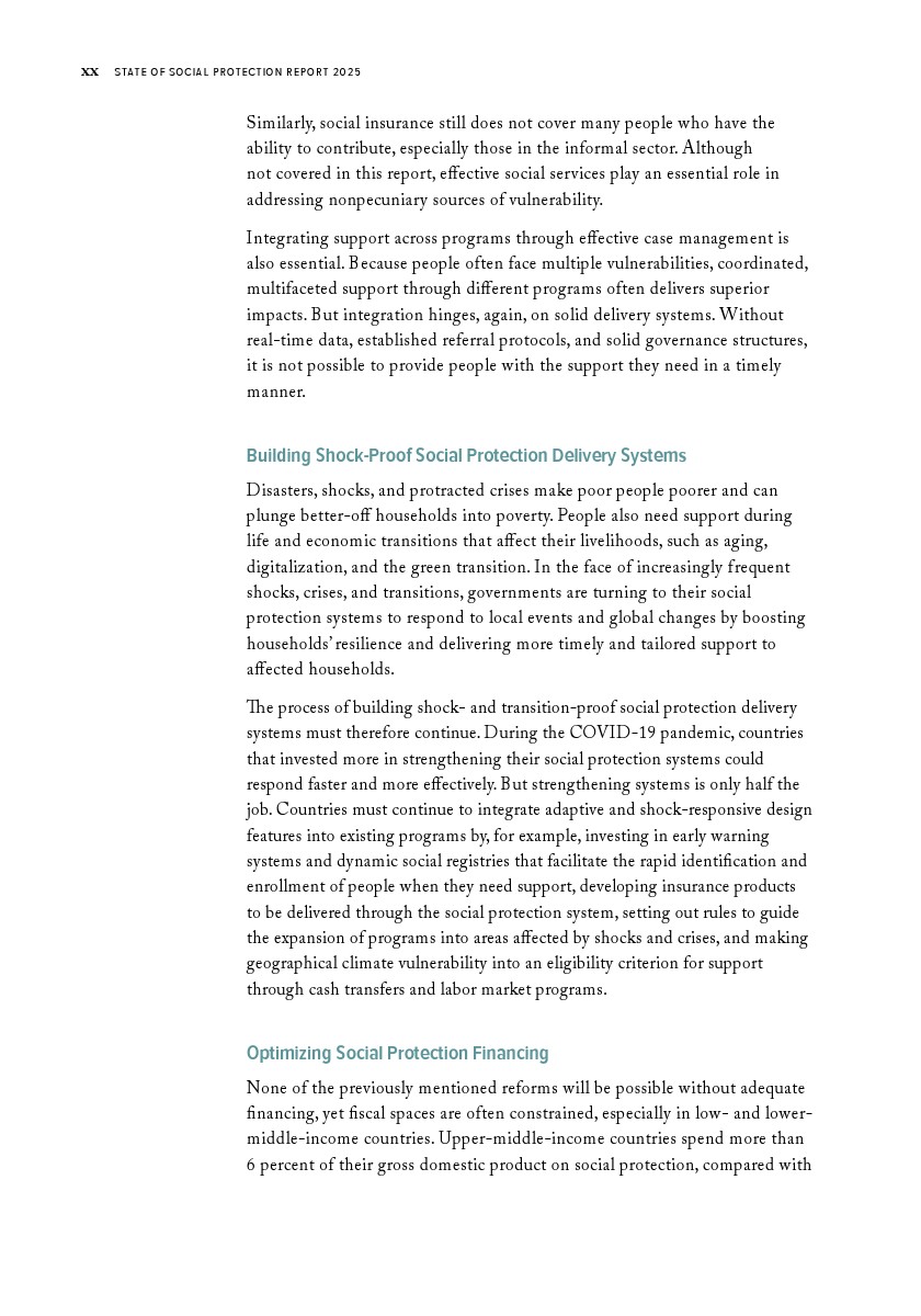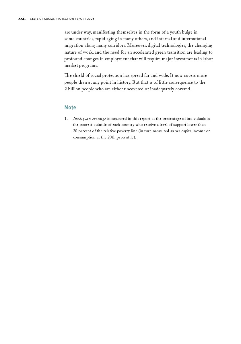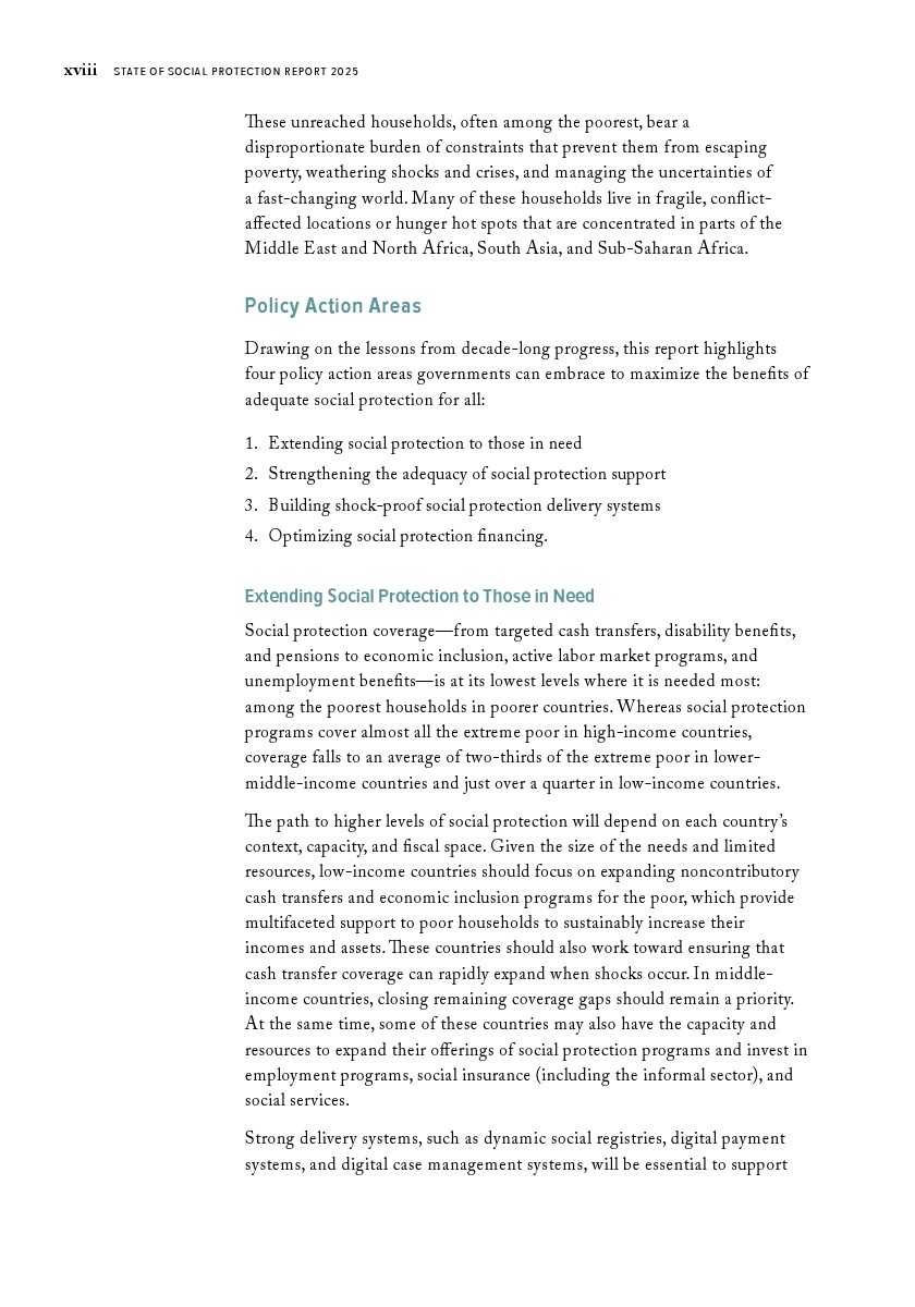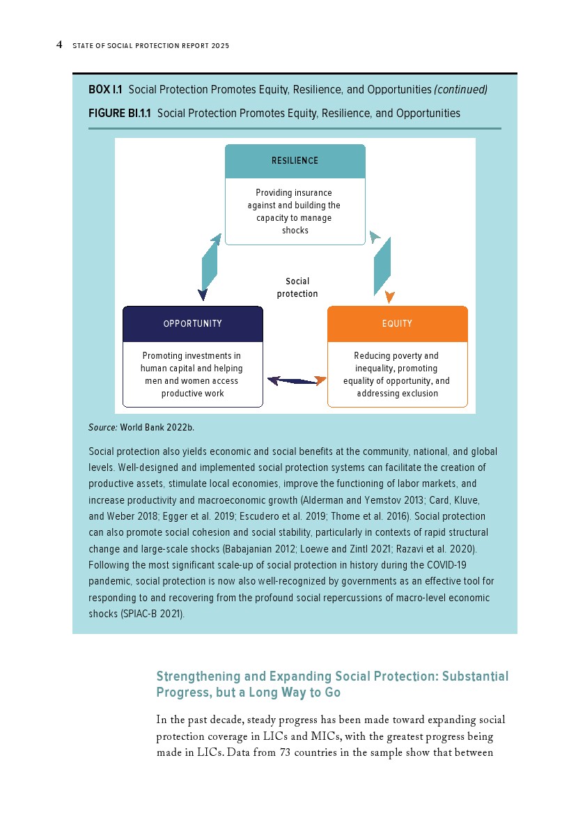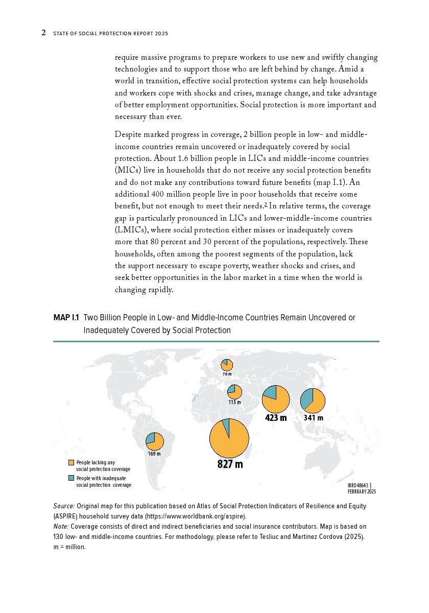 世界银行集团发布了“2025年社会保障报告”。过去十年间,低收入和中等收入国家已将社会保障覆盖范围扩大至创纪录的47亿人。在这些国家中,每四人就有三人生活在享受社会保障转移支付或通过缴费获得社会保障的家庭中。这一成就来之不易。尽管覆盖范围创下历史新高,低收入和中等收入国家仍有16亿人无法获得社会保障。另有4亿人虽被覆盖,但所获福利微薄,既难以助其摆脱贫困,也无法缓冲突发冲击、长期政治社会经济危机或重大人生转型带来的影响。
