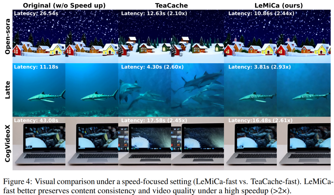 从结果中可以看出,LeMiCa对比其他主流方法,存在以下明显优势:
