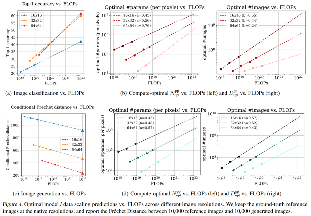 首先,最佳扩展策略强烈依赖任务类型:即使在固定的 32×32 分辨率下,分类任务与生成任务的最优 scaling 需求也完全不同,其中生成任务要达到最优效果所需的数据规模增长速度是分类任务的三到五倍。