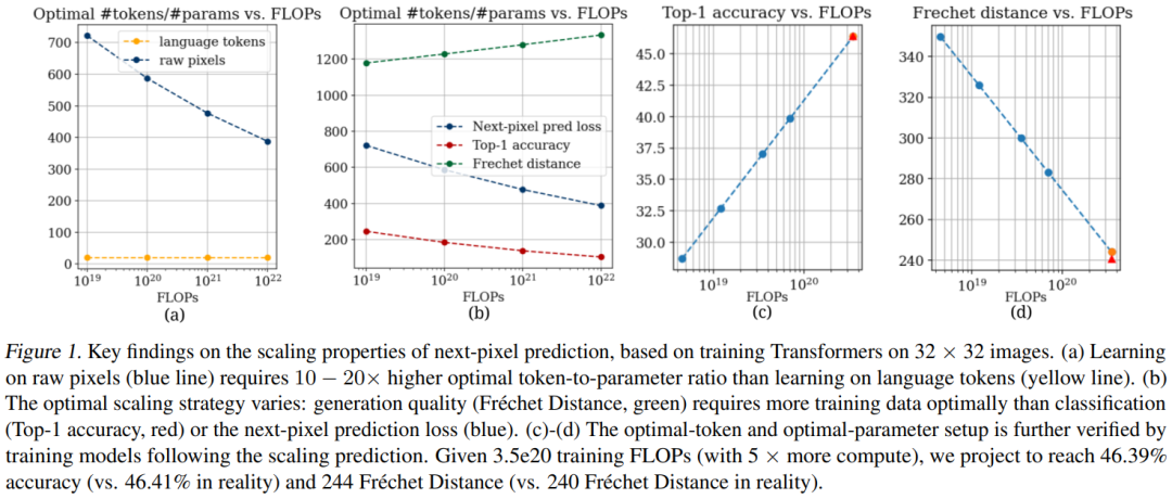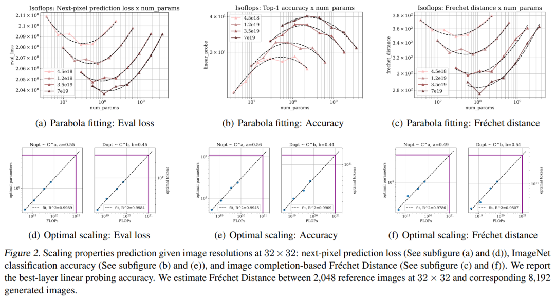 本文从 32×32 分辨率的图像出发,在多种 IsoFlops(等算力)配置下训练了一系列 Transformer 模型,最大计算量达到 7e19 FLOPs,并从三个不同指标对其性能进行评估:下一像素预测目标、ImageNet 分类准确率以及以 Fréchet Distance 衡量的生成质量。结果发现: