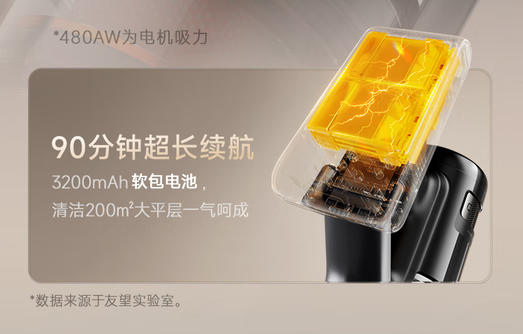电机 + 电池双重耐用:友望无刷电机吸尘器散热效率高,避免过热老化;友望 3200mAh 软包电池吸尘器循环寿命达 1000 次,5 年后续航仍能保持 80% 以上,90 分钟长续航覆盖 200㎡大户型,彻底解决 “大户型一次清洁完,吸尘器电量够吗?” 的疑问。