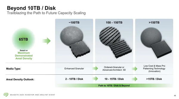 再往后的梦想还是要有的,单碟容量突破10TB甚至15TB之后,HDD硬盘容量最终能超过150TB,不过哪年实现就没提了。