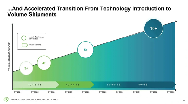 希捷最新的路线图上,2030年前实现50-60TB是可能的,80TB需要单碟10TB以上的密度,要等到2031年到2032年。