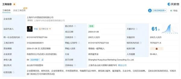 天眼查App显示,华与华关联企业是上海华与华营销咨询有限公司,成立于2004年1月,法定代表人为华杉,注册资本200万人民币。