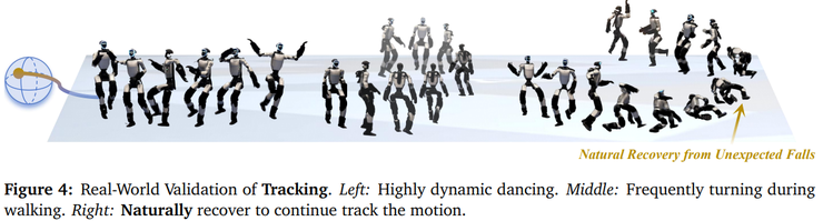 这项工作的亮点不在于某一个技巧,而在于它让机器人在真实世界中的表现第一次呈现出一种自然的连贯性。例如它能像人一样应对推搡,能从摔倒中顺势滚动再站起来,能在噪声很大的动作序列下依然跟随指令,还能在负载或摩擦突然变化时,仅通过潜在空间搜索就重新找回稳定动作。相比传统需要大量规则、脚本和专门训练任务的做法,这种方式显得更直接也更通用。