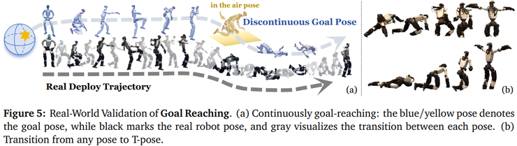 在目标姿态到达任务中,研究者随机采样了大量目标姿态,要求机器人按照顺序逐一到达。机器人在姿态之间切换时动作十分平滑,不需要人为添加插值或过渡动作,这说明其内部潜在空间具有天然的连续性。如果有些姿态本身不可能在现实中精确实现(例如关节角度超出极限),机器人会自动找到一个最接近同时又自然、安全的姿态,而不是硬要模仿导致摔倒或抽搐。