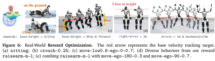 在奖励优化任务中,研究者通过各种奖励信号,让机器人自动生成对应行为。例如让它降低骨盆高度,它就会坐下或蹲起;奖励手部高度,它就会举手;奖励速度,它就会移动或转向。这些不同奖励还能组合,例如让它一边倒退一边抬手。