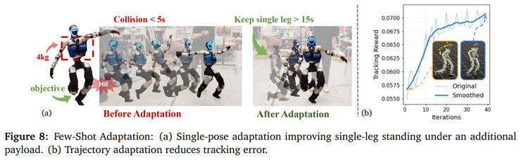 最后,研究者展示了模型的快速适应能力。在适应过程中并不需要调整网络权重,只需要针对新情况对潜在向量进行优化就行。第一个适应案例是在机器人 torso 上增加四公斤负载。原本零样本 latent 并不足以支撑单腿站立,但通过二十次交叉熵优化迭代后即可找到一个新的潜在向量,使机器人能在带载情况下稳定站立十五秒以上,而且优化结果直接迁移到真实机器人上也能成功。