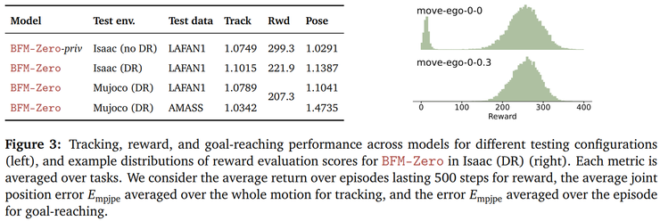 实验任务包括三类:动作跟踪、目标姿态到达以及奖励驱动的行为生成。在动作跟踪方面,模型在 Isaac 环境中加入大量物理随机化后,虽然不如理想情况下那样精准,但误差只略有上升,属于能接受的小幅变化。
