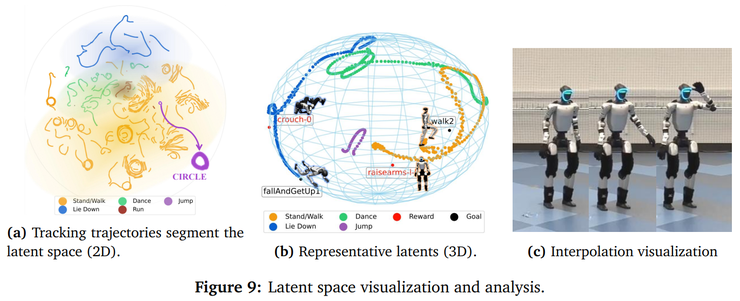 再者,这一方法为未来构建能被提示控制、能理解泛化任务意图的人形机器人打下基础。由于所有行为都被统一映射到潜在空间,机器人可以依靠潜在向量组合和调整行为。