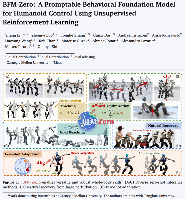 而最近 CMU 和 Meta 研究团队共同提出,清华姚班李忆唐为第一作者一篇论文引起了广泛关注。这个研究项目尝试用一种更统一更朴素的方式来训练机器人,让模型在大规模仿真中通过无监督交互自己积累经验,再把奖励、姿态、动作序列等不同形式的任务提示一并压缩到同一个潜在空间中。