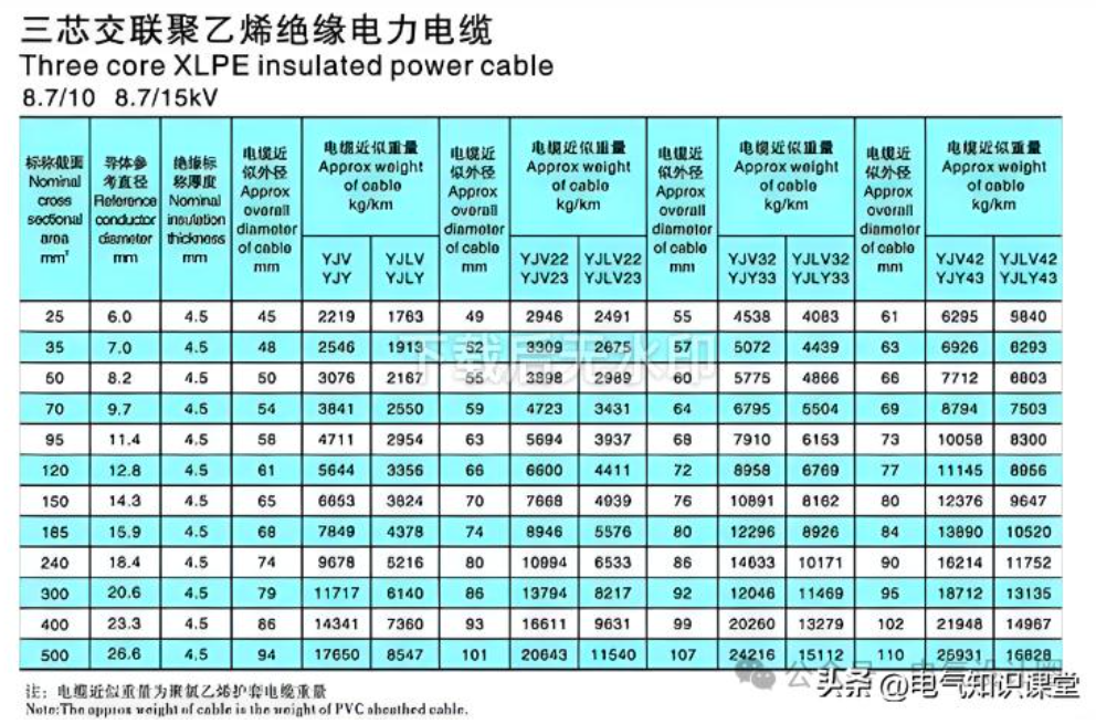为便于大家查阅与应用,我已整理出一份常用高压电缆型号参数对照表,涵盖YJV、YJV22等多种类型,详细列出截面、载流量、适用电压等级及参考标准等信息,欢迎在实际设计、施工或运维工作中参考使用,助力高效决策与精准选型。