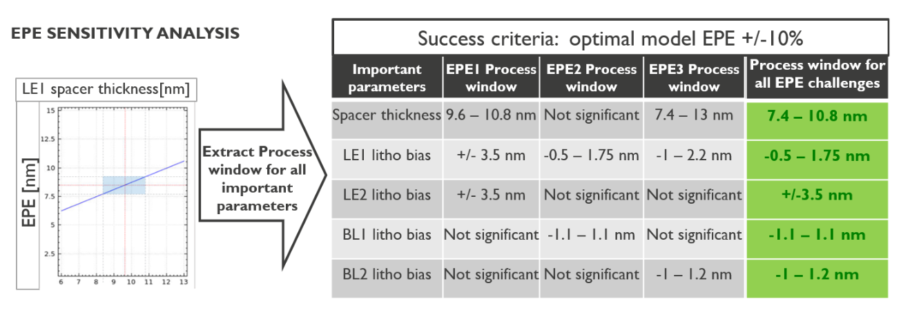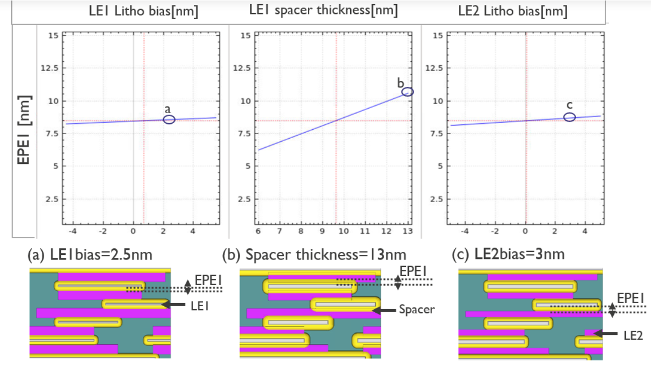 利用提取的工艺窗口进行EPE灵敏性分析,涵盖间隔器厚度、LE1石板偏置和BL1石板偏置等所有重要参数