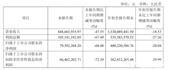 而第三季度单季度公司营业收入为8.49亿元,同比下降47.55%,归母净利润同比下降68.48%至7939.23万元,营收和利润双双下滑,未能保持业绩的增长趋势。