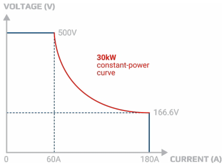 图示. 额定最大电压500V、功率30kW的EA自动量程电源输出特性图。请注意,该电源可在500V至166.6V的整个电压范围内提供满功率输出。