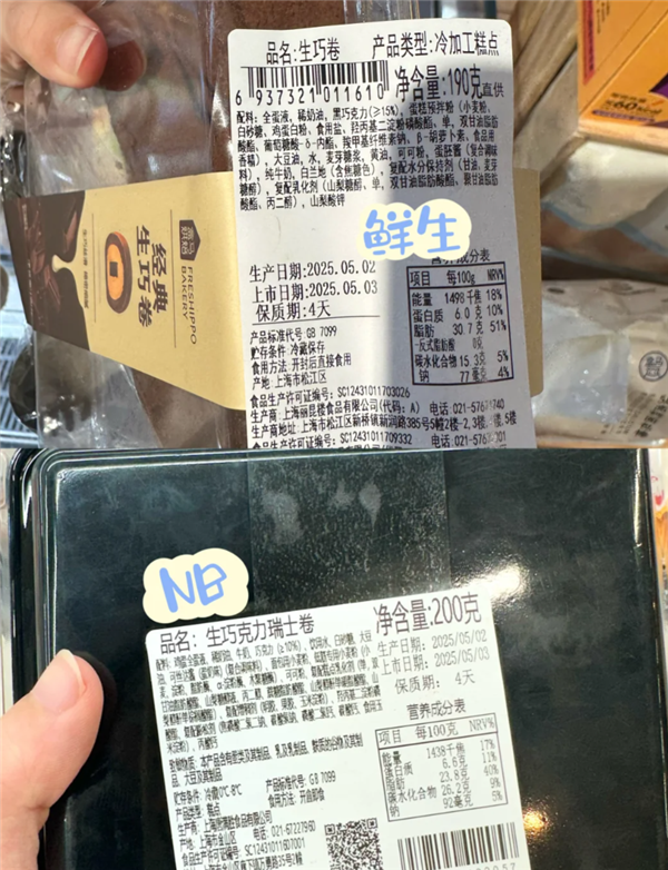 盒马卖 29.9 元 190g 的生巧瑞士卷,盒马 NB 19.9 能买 200g。只不过,一个用的黑巧,一个用的巧克力。