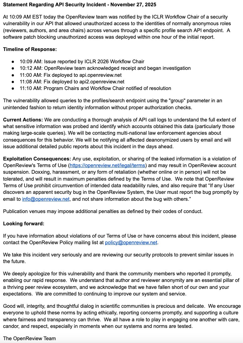 在大概周五零点,bug 被紧急修复,ICLR 终于发布了官方声明。