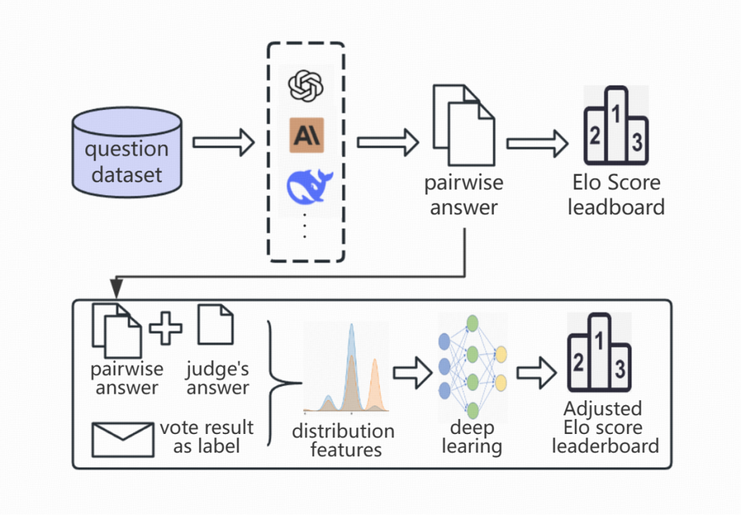 这项研究针对现有评估中不同 LLM 评委存在的系统性自偏好偏差以及评分不一致问题,通过轻量级神经网络动态调整 Elo 评分系统的 K 因子与胜负概率,实现实例级别的去偏矫正正。其核心思想是将所有评委评分的集体共识作为无监督优化目标,通过最小化各评委 Elo 轨迹的离散度来抑制极端个性偏差,同时利用评委自身回答的语义等特征检测自偏好倾向。该框架有效提升了低质量评委的表现,使其接近高质量评委水平,显著增强了评估的鲁棒性、可复现性与人类对齐度。