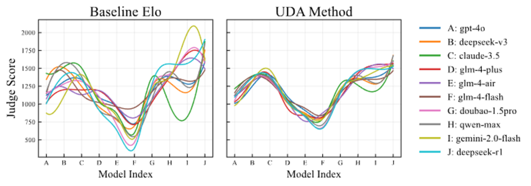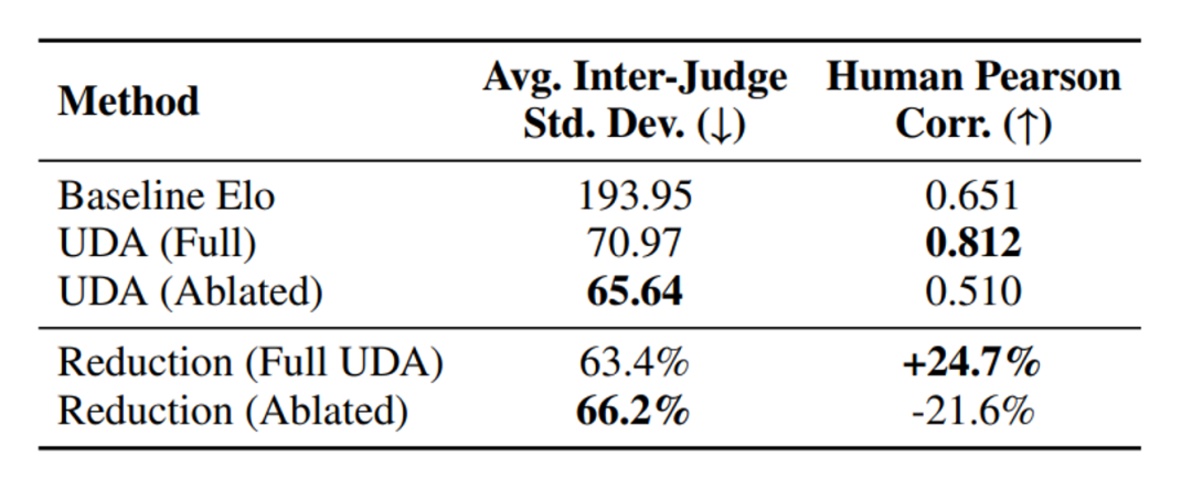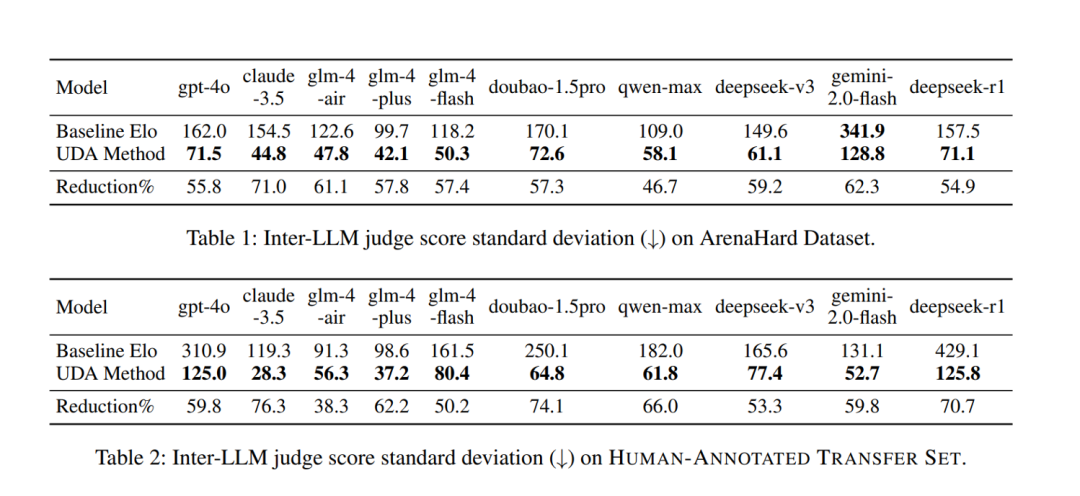 1. 跨模型方差锐减:UDA 将平均裁判间标准差从 158.5 降至 64.8(↓59%),最激进的 gemini-2.0-flash 偏差从 341.9 压缩至 128.8,证明对极端偏差的强效抑制。
