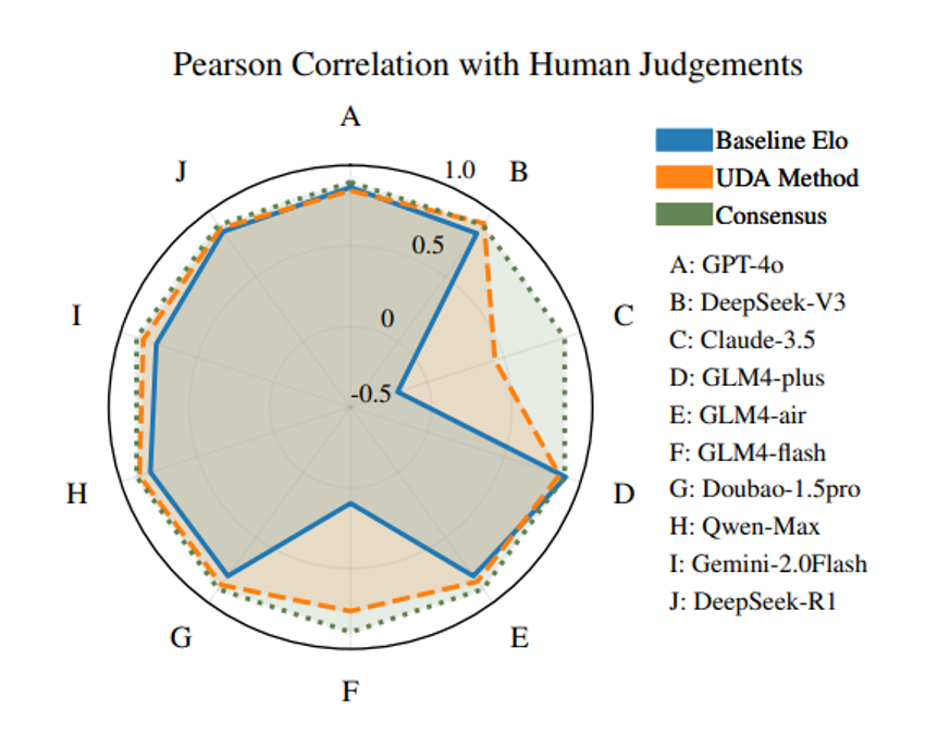 UDA 的出现,为破解这一困局提供了新思路。来自智谱 AI 的研究团队将无监督学习引入成对 LLM 评判体系,让模型能够自主动态调整评分规则,实现去偏对齐。