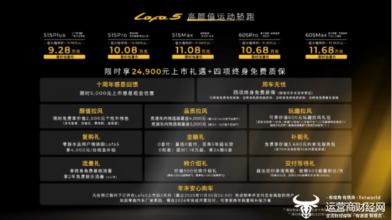 新车发布515km及605km两种续航版本共计5款车型,并推出限时5000元上市感恩现金优惠,即日起至2025年12月31日24点,零跑Lafa5上市限时惊喜价9.28-11.68万元,以极其诚意的定价与品价比,重新定义10万级纯电轿跑市场价值新标准。