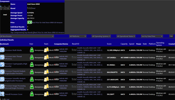 SiSoftware测试数据显示,Xeon 696X在多媒体基准测试中获得了12389.50 Mpix/s分,相比于W9-3495X(56核心型号,得分8463.41 Mpix/s),性能提升46%。