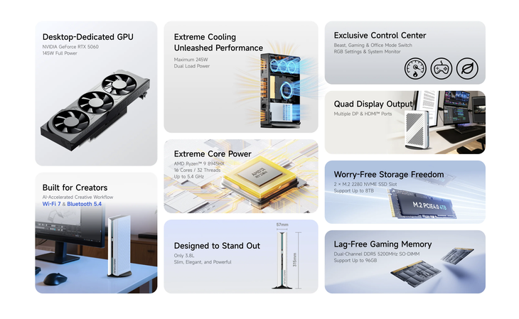 性能核心方面,AtomMan G1 Pro搭载了基于Zen 4架构的AMD Ryzen 9 8945HX处理器,拥有16核心32线程,加速频率可达5.4GHz,并集成了Radeon 610M核显;同时配备了台式机级别的英伟达GeForce RTX 5060显卡,为3A游戏和专业创作提供强劲动力。设备还配有双SO-DIMM插槽,支持DDR5-5200内存,最大可安装96GB,并拥有两个均支持PCIe 4.0 x4通道的M.2 2280规格插槽,为高速数据读写和多任务处理提供了坚实基础,网络方面则支持最新的Wi-Fi 7和蓝牙5.4技术。