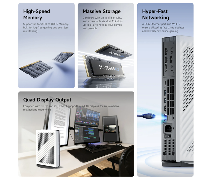 为了满足多设备连接和多屏输出的需求,Minisforum为该设备提供了极为丰富的接口配置。机身前面板便捷地布置了一个USB 3.2 Gen2 Type-A接口、一个USB 3.2 Gen2 Type-C接口以及一个音频插孔,方便用户连接常用外设。而后面板则提供了更为强大的扩展能力,包括两个HDMI 2.1接口、两个DP 2.1b接口和一个DP 1.4a接口,轻松实现多显示器协同工作,同时配备了一个5Gbps网口、一个USB Type-C接口和两个USB 3.2 Gen2 Type-A接口,确保了与各类外设的广泛兼容性和高速数据传输。