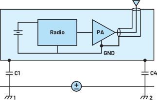 图1. 从技术上讲,即使像手持设备这样小的系统也可能受到外界的影响。在此示例中,接地环路非常小,任何干扰电流都将流向屏蔽层而不是无线电接地。
