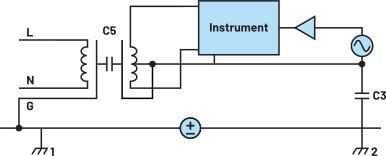 图2. 上图所示为线路供电仪器,机箱接地1和机箱接地2之间有接地环路电压。同时,该环路很大,足以使磁耦合干扰变得显著。另请注意,干扰环路与仪器接地共用一根导线。