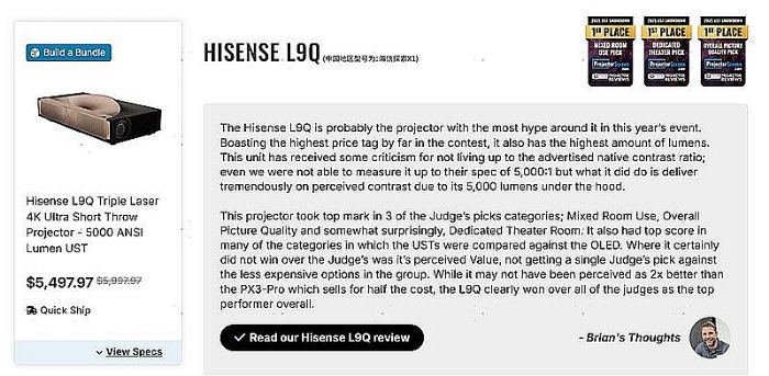 在此次UST Projector Showdown中,海信激光电视产品还凭借出色的产品配置与定价策略,斩获“年度最佳性价比大奖”,充分印证其在高端性能与大众可及性之间的出色平衡。
