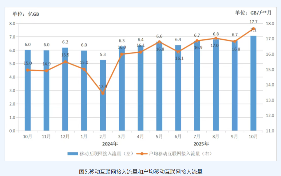 在电信业务使用情况方面,2025年1-10月,上海市移动互联网累计流量达64.2亿GB,同比增长19.2%。其中,5G移动互联网接入累计流量达45.6亿GB,累计5G流量占比为71.1%。10月当月户均移动互联网接入流量(DOU)为17.7GB/户·月。