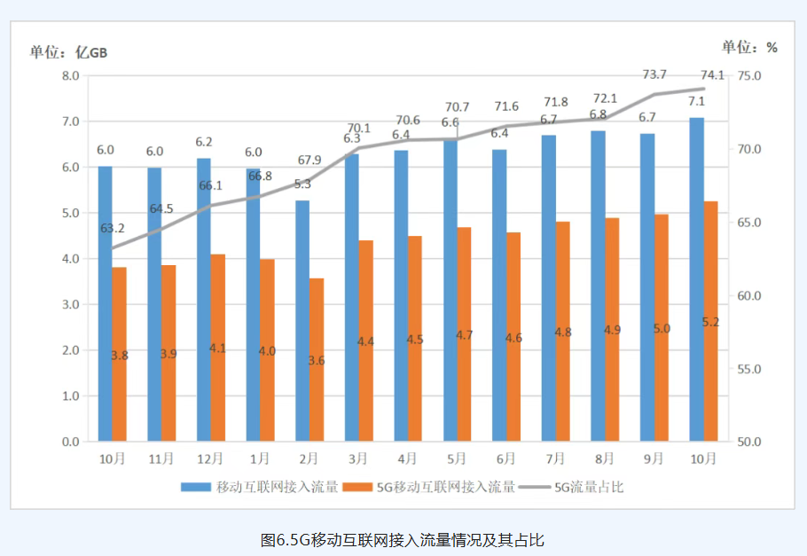 在用户数量方面,截至10月末,上海各基础电信企业移动电话用户数达4770.7万户,同比降低0.7%。其中,5G移动电话用户数为2602.0万户,同比增长12.1%,较上年末净增306.7万户;5G移动电话用户在移动电话用户总数中占比达到54.5%,5G用户普及率达105.1部/百人,位居全国第二。