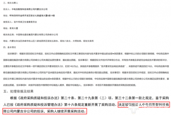 接下来,首轮排名第二的中电信数智科技有限公司内蒙古分公司,向当地财政局提交投诉,要求确认自身中标资格。但监管部门表明鉴于采购活动已重新开展,原中标候选人排序自动失效,决定驳回投诉。所以,内蒙电信数智公司也没顺延中标。