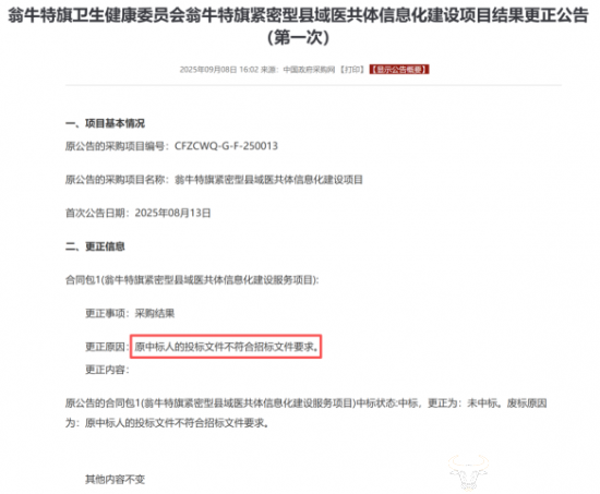 正当业内以为赤峰移动顺利拿下项目时,9月招标方突然发布更正公告,明确指出“原中标人的投标文件不符合招标文件要求”,取消其中标资格。