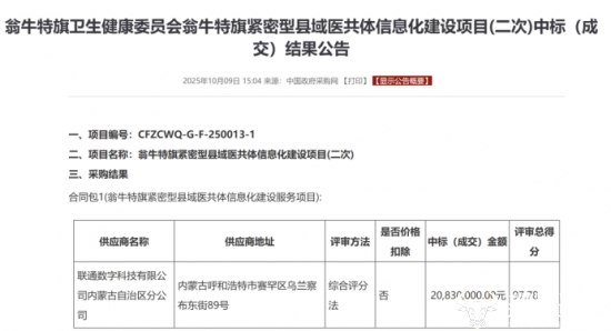 近日,内蒙古赤峰下属的翁牛特旗卫生健康委员会预算2330万元的紧密型县域医共体信息化项目,三大运营商同时竞标,结局出人意料。