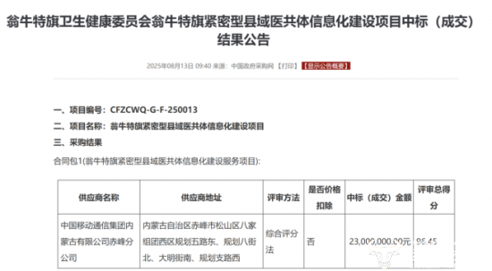8月初首轮招标结果公示,中国移动赤峰分公司以2300万元报价、96.45分的综合得分拔得头筹中标。