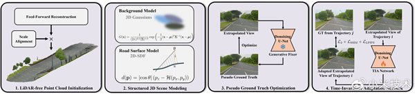 小米汽车团队以3D高斯泼溅(3DGS)为技术基底,创新设计四阶段处理流程:通过视觉衍生“伪点云”实现无激光雷达点云初始化,规避局部最优。