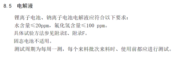 新国标中,关于电解液的具体要求