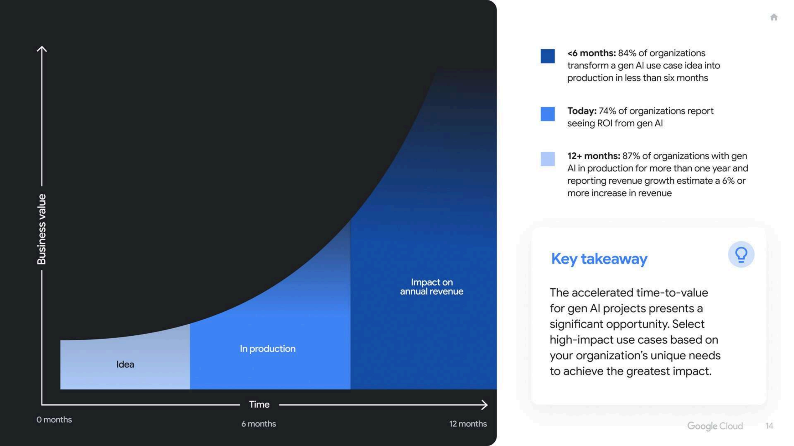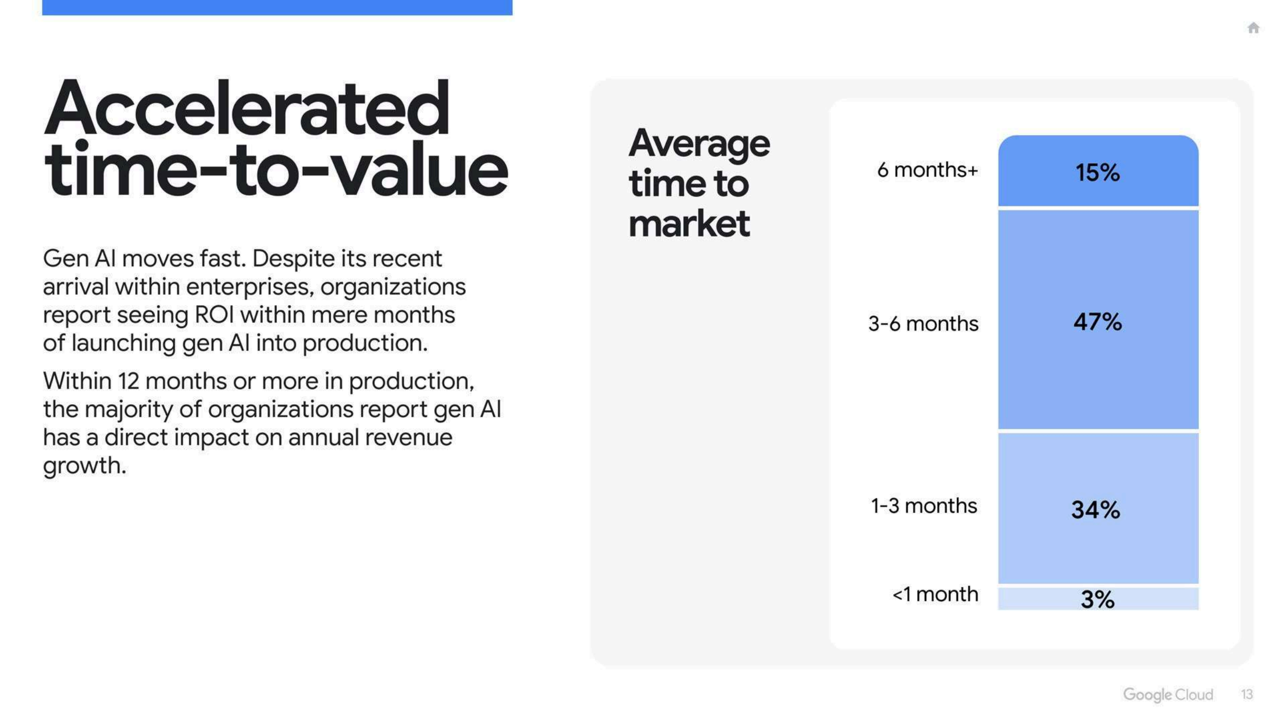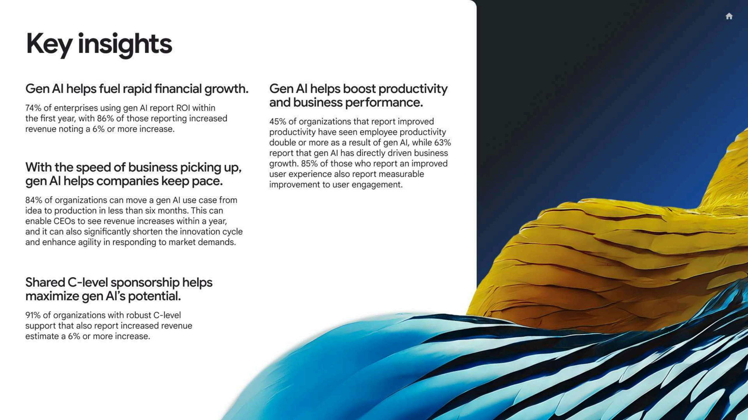 在”回本速度”上,74%的组织已经在至少一个生成式AI用例上实现正向ROI,且多在一年内见效。在这些已经看到收入增长的企业中,86%估计公司整体年收入提升6%以上,显示生成式AI并非边角料收益,而是对营收产生可感知的拉动。同时,84%的企业可以在六个月内把一个生成式AI想法推向生产,这种从概念到落地的加速,正在压缩传统IT项目的投资回收周期。