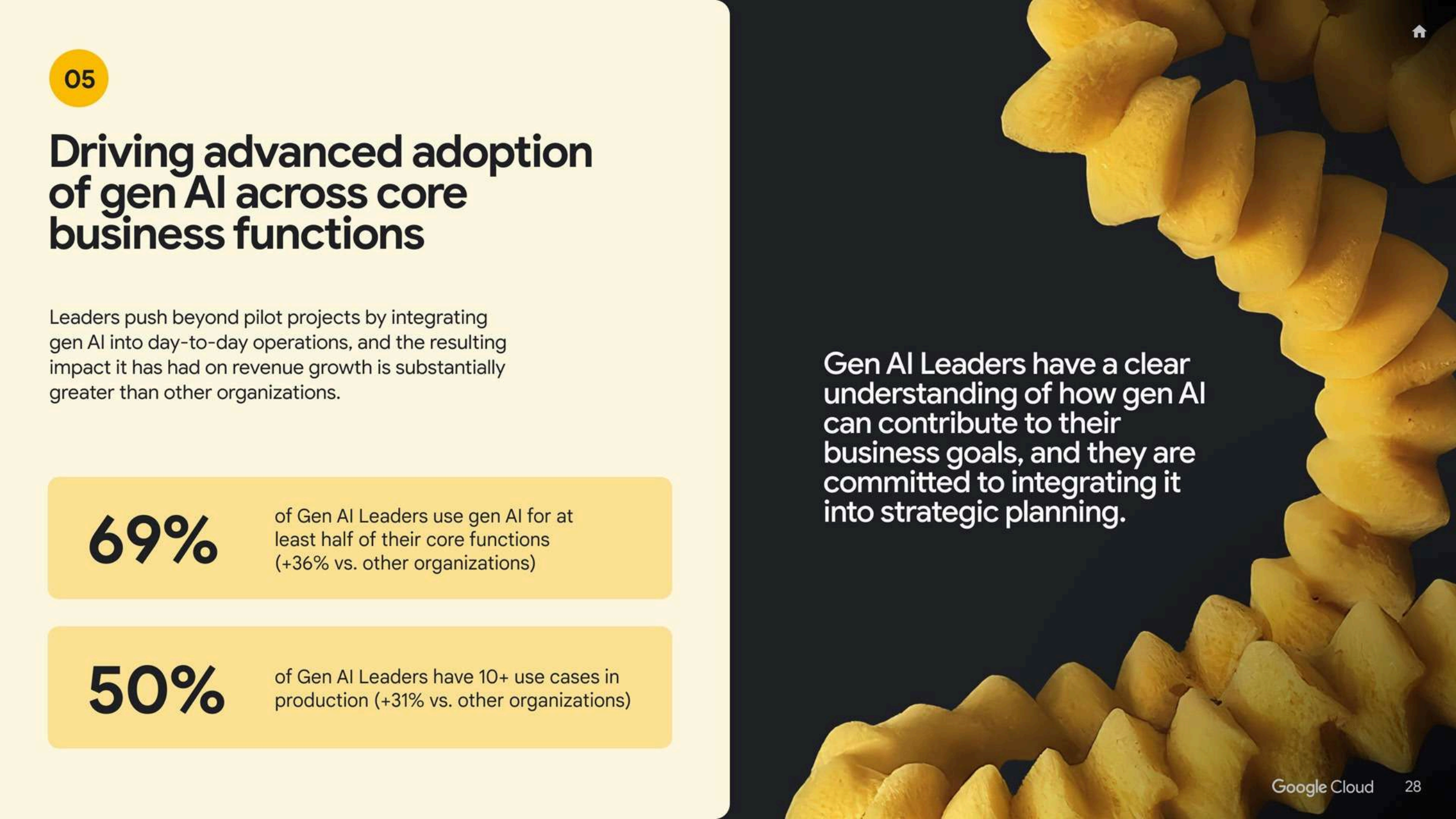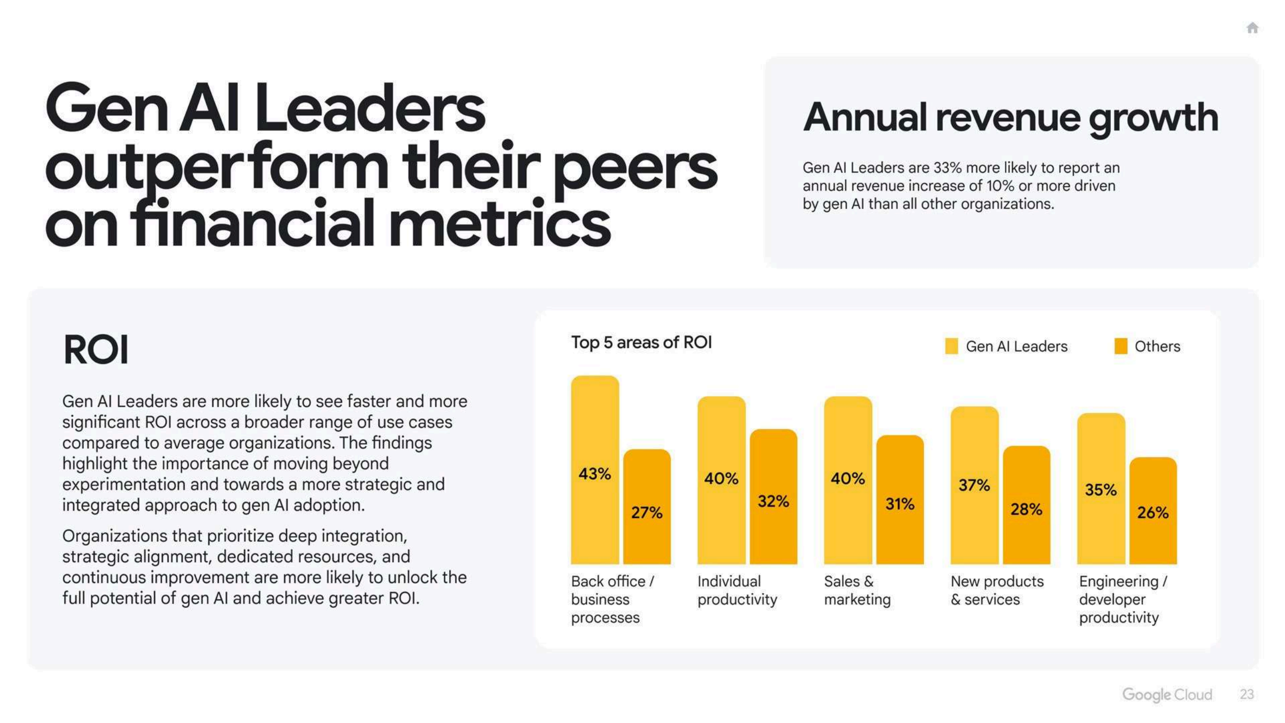 报告特别圈定了一类”生成式AI领军者”——在生产环境拥有四个及以上用例、且过去一年将至少15%运营支出投入生成式AI的企业,这一群体仅占样本的16%。这些领军者中,43%在后台流程、40%在个人生产力、37%在销售与营销等领域率先获得更高、更广的ROI,并且其通过生成式AI带来的年收入增幅在10%以上的比例,较其他企业高出约三分之一。69%的领军者已经在至少一半核心业务职能中部署生成式AI,50%拥有10个以上生产用例,形成从点状试验转向组织级重构的清晰分水岭。