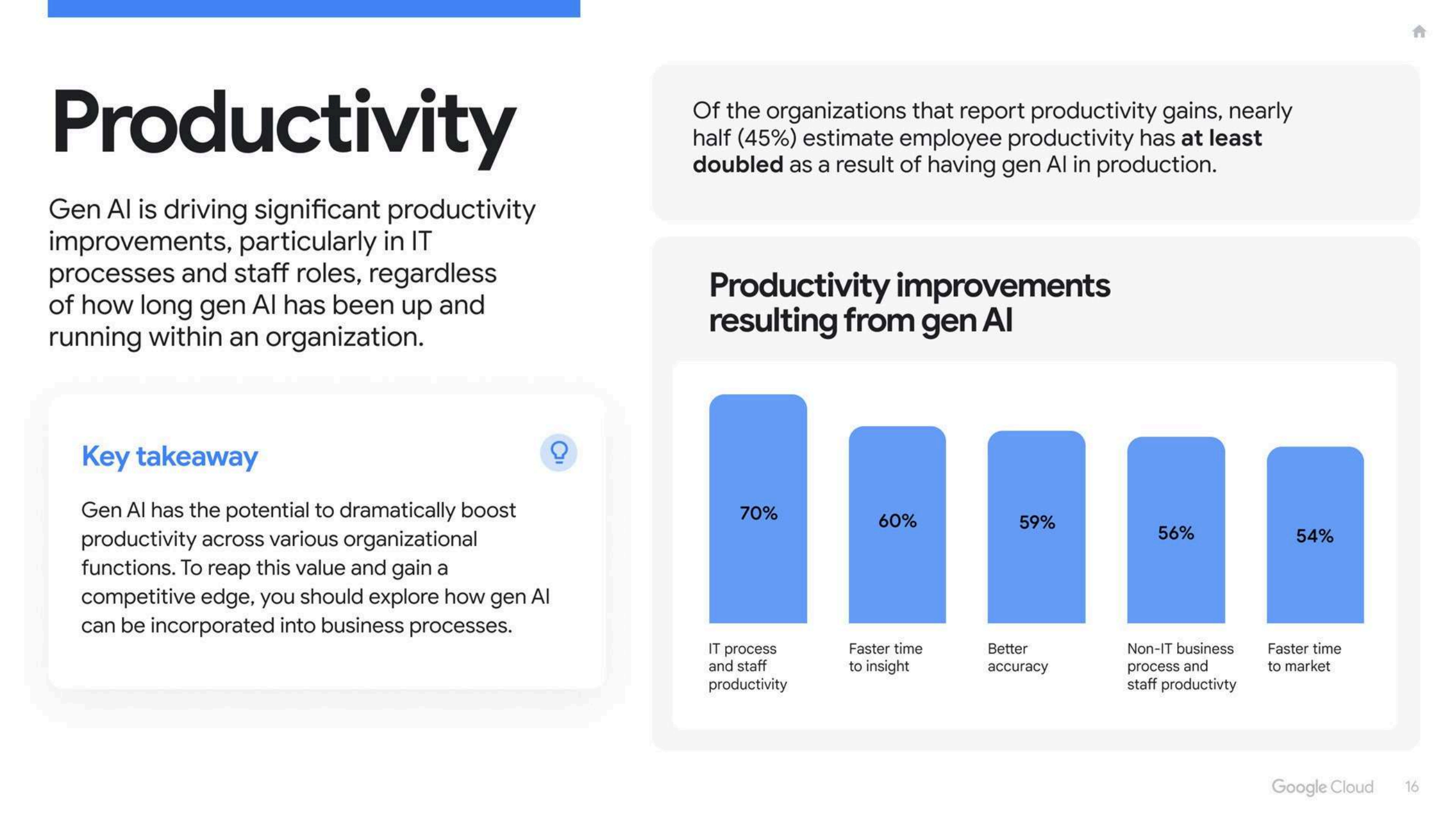 从运营侧看,生产力跃升是最突出的直接收益:在报告中,报告生产力提升的企业中,有45%认为员工生产力至少实现”翻倍”。在具体环节上,IT流程和员工效率、洞察获取速度和上市时间均出现显著改善,其中IT流程与员工生产力、非IT业务流程效率等指标提升比例均在五到七成区间。