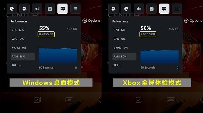 性能永远是游戏设备的核心,通过系统监测界面可以直观看到对比数据:传统Windows桌面模式下内存使用量为8.6GB(占用率55%),而Xbox全屏体验模式下仅为7.8GB(占用率50%)。也就是说,Xbox全屏体验不仅在便利性上有所提升,更在系统层面进行了优化。数据显示,这一界面比传统Windows桌面节省5%以上的内存使用量。